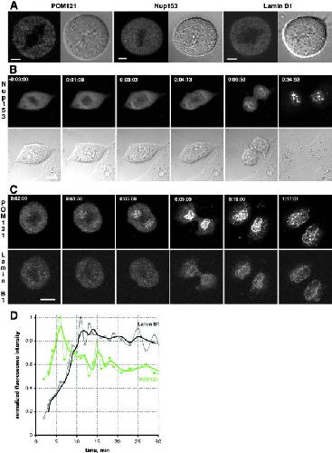Live fluorescence imaging reveals early recruitment of emerin, LBR, RanBP2, and Nup153 to reforming functional nuclear envelopes.