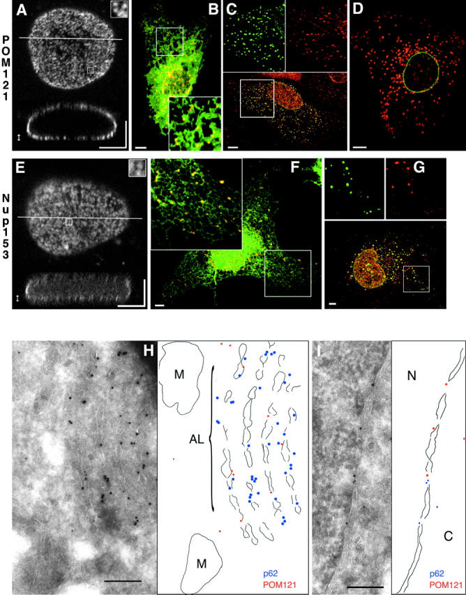 Figure 1. POM121-GFP and GFP-Nup153 label single NPCs and induce AL in live cells. (A–G) Images are confocal z-stacks (A and E) or single sections (B–D, F, and G). (A) Three-dimensional reconstruction of a live NRK cell nucleus expressing POM121-EGFP3. Top, maximum intensity projected of optical sections of the lower nuclear surface (double-pointed arrow). Inset enlarges 1 μm2 to show labeling of single NPCs. Bottom, xz slice at the line indicated in the top panel. (B) Live PtK2 cell coexpressing POM121-YFP3 (red) and SRβ-ECFP (green). AL labeled by POM121 are in direct contact to or colocalize with ER tubules and sheets as marked by SRβ. (C) HeLa cell expressing POM121-EGFP3 (green), fixed and stained for the endogenous nucleoporin p62 (red). Since the p62 antibody did not cross-react in PtK2 cells, HeLa cells were used for this experiment. AL containing POM121 colocalize with p62 antibodies (yellow in the merged lower panel, compare patterns in the split inset images). (D) Live PtK2 cell coexpressing ECFP–lamin B1 (green) and POM121-YFP3 (red). AL labeled by POM121 do not contain lamin B1. (E) Three-dimensional reconstruction of a live NRK cell nucleus expressing EGFP3-Nup153. Projections as in A. (F) Live COS7 cell coexpressing EGFP3-Nup153 (red) and SRβ-ECFP (green). COS7 cells were used for better ER morphology than NRK cells (compare with B). Yellow shows colocalization of AL with ER tubules. (G) COS7 cell expressing EGFP3-Nup153 (red) fixed and stained for the en-dogenous nucleoporin POM121 (red). AL containing Nup153 also label with anti-POM121 antibodies (yellow in the merged lower panel, compare patterns in the split inset images). Some POM121-positive structures do not contain Nup153. (H and I) Cryoimmuno double labeling electron micrographs from HeLa cells expressing POM121-EGFP3. Membrane boundaries are outlined next to the micrographs. Labeled are rat POM121 (10-nm gold) and human p62 (5-nm gold). POM121 and p62 colocalize on fenestrated membrane stacks (AL) in H and nuclear pores in I. M, mitochondria; N, nucleus; C, cytoplasm. Bars: (A–G) 5 μm; (H and I) 200 nm.
