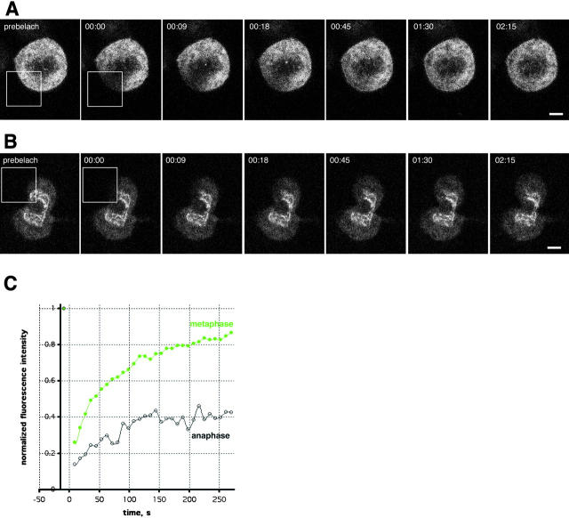 Figure 6. POM121 is immobilized during nuclear assembly in anaphase. FRAP of a NRK cell transiently expressing POM121-EGFP3. (A) Boxed area was photobleached to background levels in metaphase. Recovery was monitored every 9 s in a single image acquired with open pinhole. Note rapid recovery of fluorescence into the ER as the cell reaches metaphase/anaphase transition (02:15). (B) FRAP of the same cell as in A ∼6 min after anaphase onset. Note the absence of complete recovery during the transition to telophase. Times, hh:mm:ss. (C) Plot of recovery in the bleached areas shown in A and B for metaphase (green)and anaphase (black). Data was normalized to total loss of fluorescence, time 0 corresponds to the midpoint of the bleach. Note the difference in IFs 4 min after the bleach. Bars, 5 μm.