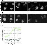 Figure 5. Recruitment of nucleoporins and lamin B1 during nuclear assembly. (A) In vivo localization of transiently expressed POM121-YFP3, EGFP3-Nup153, and ECFP–lamin B1 in metaphase NRK cells. Shown are confocal sections and DIC images centered on the metaphase plate. Note reticular pattern for POM121 and diffuse distribution of Nup153 and lamin B1. (B) 4-D sequence (10 slices every 2.5 μm acquired every 10–60 s depending on the dynamics of the cell cycle stage) of an NRK cell transiently expressing EGFP2-Nup153. Transparent projection of the four slices containing chromosomes (top) and DIC images highlighting the position of the chromosomes (bottom) are shown. Recruitment of Nup153 on the surface of chromosomes starts at ∼4 min after metaphase to anaphase transition. Time, h:mm:ss normalized to meta/anaphase transition equals 0. (C) 4-D double label sequence (six slices every 3 μm acquired every 30–120 s depending on the dynamics of the cell cycle stage) of an NRK cell transiently coexpressing POM121-YFP3 (top) and ECFP–lamin B1 (bottom). Shown are maximum intensity projections of the z-slices containing chromosomes. POM121 recruitment starts ∼3.5 min after meta/anaphase transition, whereas lamin B1 is only seen at 9 min (see D). Time, h:mm:ss normalized to meta/anaphase transition equals 0. (D) Plot of mean fluorescence intensity of the reforming NE for POM121 (green) and lamin B1 (black) shown in B. Before visible accumulation of lamin, nuclear rim areas were identified by POM121 localization. Data was background subtracted and normalized for bleaching during the time series. Lines are moving averages of two frames. Note the delay of ∼5 min between peak concentration/area for POM121 versus lamin B1. Bars: (A) 5 μm; (B and C) 10 μm. Online supplemental material (Fig. S2) is available at http://www.jcb.org/cgi/content/full/200101089/DC1.