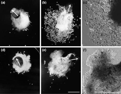 Figure 5. Ectopic expression of ADAM 13 causes perturbation of cell spreading on fibronectin. Animal cap explants expressing (b) wild-type ADAM 13 or (e,f) the protease-defective E/A point mutant were cultured on fibronectin substrates in the presence of 20 U/ml activin-A. (a) Under these conditions, noninjected explants undergo convergence extension movements (arrow), while cells in contact with the substrate spread and migrate away from the explant as a cohesive sheet. (b) Explants expressing wild-type ADAM 13 also undergo convergence extension movements (arrow), but (b,c) the cells in contact with the substrate are round and dispersed. These cells remain viable during the course of the assay as determined by trypan blue exclusion (data not shown). (d) Extensive cell spreading occurs in cap cell explants expressing wild-type ADAM 13 in the presence of 0.25 mM BB-3103 protease inhibitor. (e,f) Cell spreading is also observed in animal cap explants expressing the protease-defective E/A mutant construct. (c,f) Higher-magnification views of explants in (b) and (e), respectively. (a,b,d,e, arrows) Converging and extending explant tissue above the plane of focus. The scale bars in (e) and (f) represent 1 mm