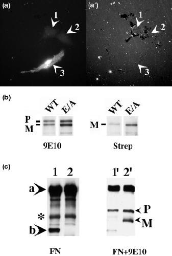 Figure 7. The E/A ADAM 13 inhibits endogenous ADAM 13 remodeling of fibronectin. Xenopus XTC cells were plated on fluorescent fibronectin for 24 hr prior to fixation. (a) Cells expressing the E/A ADAM 13 were detected with the 9E10 mAb. Fields containing both transfected (arrowhead 3) and nontransfected (arrowheads 1 and 2) cells were selected. The fluorescent fibronectin substrate within the same field is presented in (a′). (a′) During this longer period of incubation (24 hr), nontransfected cells remodeled the substrate (arrowheads 1 and 2), while the cell expressing the E/A ADAM 13 did not (arrowhead 3). (b) Surface-biotinylated XTC cells transfected with either wild-type or E/A ADAM 13 were extracted and immunoprecipitated with mAb 9E10. Immunoprecipitated proteins were separated by SDS-PAGE and transferred to nitrocellulose. Blots were either incubated in mAb 9E10 for the detection of total ADAM 13 protein (left panel) or in streptavidin-HRP for the identification of ADAM 13 at the cell surface (right panel). In each case only the mature form (M) of wild-type ADAM 13 or the E/A mutant is present at the cell surface. (c) Embryos overexpressing wild-type ADAM 13 were extracted in the presence of BB-3103. Immunoprecipitated wild-type ADAM 13 was incubated with immunoprecipitated fibronectin in the absence (lane 1) or the presence (lane 2) of 0.5 mM BB-3103 for 1 hr at 20. The immunoprecipitated fibronectin was analyzed by a Western blot with the 4H2 mAb (left panel). The same blot was then probed with mAb 9E10 for the detection of wild-type ADAM 13 (right panel). The mature (M) form of ADAM 13 is only seen in lane 2′, and this observation confirms the efficiency of the BB-3103 inhibitor in these experiments. The arrowheads in the left panel of (c) point to intact fibronectin (arrowhead a) or the major specific degradation product (arrowhead b, 90 kDa). The asterisk points to a 120 kDa fibronectin fragment, the formation of which is independent of ADAM 13
