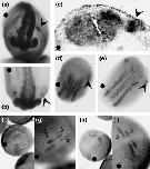 Figure 3. Overexpression of ADAM 13 does not affect central nervous-system formation. Whole-mount in situ hybridization of embryos expressing (a,c,d) wild-type ADAM 13 or (b,e) the E/A mutant constructs were processed with (a) the pan-neural marker Xsox-2 and (d,e) the neuronal marker N-tubulin. Black dots indicate the transcript-injected half of each embryo. Embryos expressing wild-type ADAM 13 lack Xsox-2-positive cells in the vicinity of the otic vesicle; (a) such cells are present in the E/A and noninjected control halves of each embryo (arrowheads). (c) Transverse section at the level of the putative otic vesicle of an embryo in a stage similar to that in (a). Dorsal views of both (d) wild-type and (e) E/A-expressing embryos at the early-neurula stage (stage 15). (d,e) Lateral expression of N-tubulin within the putative trigeminal ganglion (black arrowheads) is absent from (d) the wild-type-injected side. (f) Dorsal views of neurula-stage (stage 19) embryos overexpressing (f,g) wild-type or (h,i) E/A ADAM 13 and hybridized with the Xkrox-20 probe. The localization of Xkrox-20 in rhombomeres 3 and 5 is identical in the uninjected control side compared to the injected side of each embryo