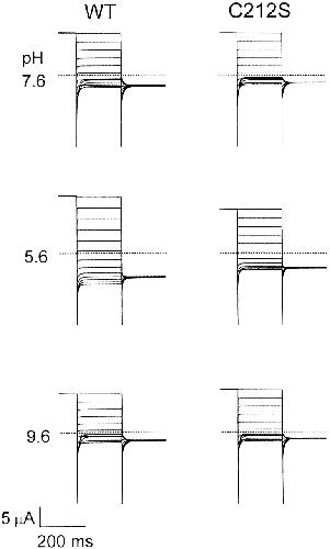 Figure 3. External pH effect on the macroscopic current of the WT and the C212S mutant. The recording traces at different pH were from the same oocyte. Voltage protocols are the same as in Fig. 2 A except that a maximal depolarizing test voltage of +80 mV was used. Dotted lines are the zero current level. |