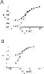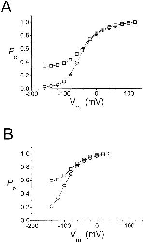 Figure 7. External H+ modulation of the fast gate Po-V curve of C212S at saturating and nonsaturating [Cl−]o. Data were derived from macroscopic current recordings at pH 7.6 (○) and 5.6 (□). (A) Comparison of the Po-V curves under different pH at 15 mM [Cl−]o (n = 3). (B) Comparison as performed in A at 300 mM [Cl−]o (n = 3–4). Data points were connected with short straight lines. |