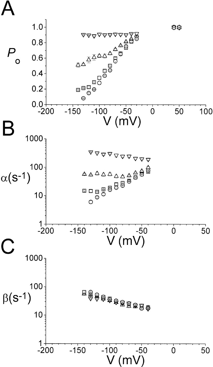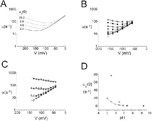Figure 6. Fast gating properties of single C212S channels at different external pH. (A) Steady-state open probability. (B) Opening rate of the fast gate. (C) Closing rate of the fast gate. All rate constants were calculated according to and . External pHs were as follows: ▿, 5.6; Δ, 6.6; □, 7.6; and ○, 9.6. |