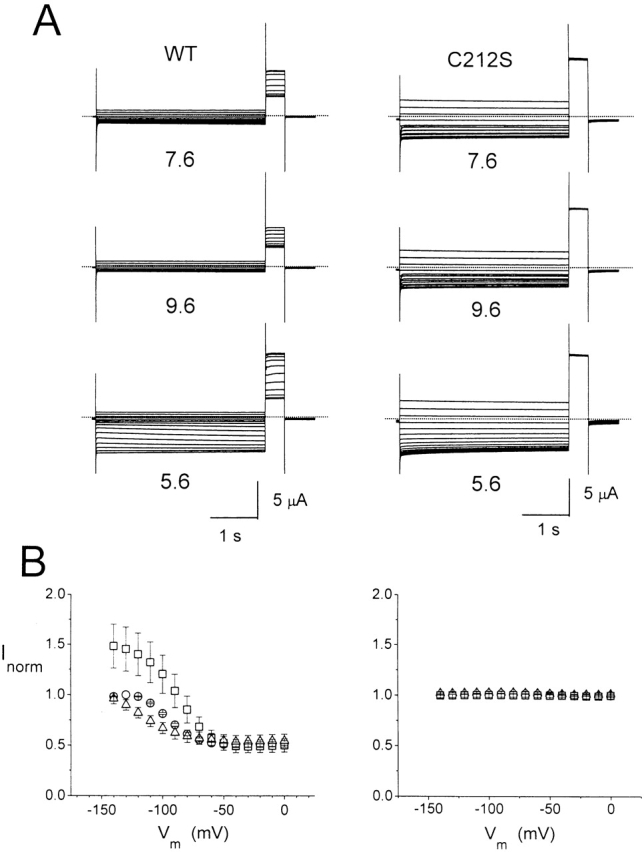 Figure 1. Quasi steady-state inactivation curves of the WT ClC-0 and the C212S mutant at different pH values. (A) Whole oocyte currents of the WT and C212S at three external pH. See materials and methods for the voltage protocol to examine the slow-gate inactivation. Dotted lines represent zero-current level. (B) Quasi steady-state inactivation curve of the WT (left, n = 3) and the C212S mutant (right, n = 4) at pH 7.6 (circles), 9.6 (triangles), and 5.6 (squares). |