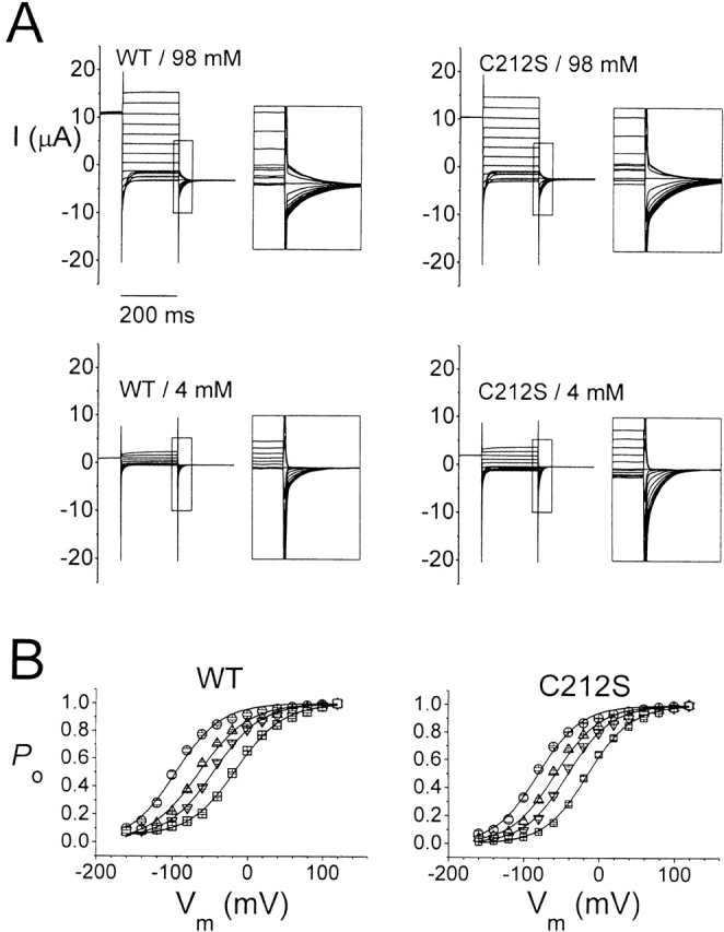 Figure 2. Effect of the external Cl− concentration on the fast gating of the WT channel and the C212S mutant. (A) Whole-cell current of the WT- and C212S-injected oocytes at 98 and 4 mM [Cl−]o. Voltage protocol is as described in materials and methods with a maximal depolarized voltage of +120 mV. (Insets) Expanded current traces corresponding to those within the squares to demonstrate the initial current of the fast gating relaxation at −100 mV. (B) Steady-state Po-V curve of WT and C212S at various [Cl−]o. Symbols are as follows: ○, 98 mM; Δ, 30 mM; ▿, 15 mM; and □, 4 mM. Solid curves were drawn according to a Boltzmann equation: Po = Pmin + (1 − Pmin)/[1 + exp(−zF(V − V1/2)/RT)], with z = 0.8–1.2, Pmin = 0.03–0.05. V1/2's were as follows: for WT, −91 (98 mM), −60 (30 mM), −42 (15 mM), and −14 mV (4 mM); for C212S, −79 (98 mM), −56 (30 mM), −39 (15 mM), and −12 mV (4 mM). |