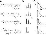 Figure 5. Single-channel recordings of C212S at different external pH. (A) Single-channel recording traces at the indicated external pH. Dotted lines are the assigned three current levels. C, closed state of the channel; O, fully open state of the channel. (B) All points amplitude histograms compiled from 30 s (pH 9.6), 30 s (7.6), 40 s (6.6), and 40 s (5.6) recording traces containing the example segments shown in A. The measured state probabilities (f0, f1, and f2) are as follows: (pH 9.6) 0.298, 0.491, and 0.211; (pH 7.6) 0.232, 0.496, and 0.272; (pH 6.6) 0.071, 0.402, and 0.527; (pH 5.6) 0.010, 0.214, and 0.776, resulting in the calculated Po values shown in A. Assuming a binomial distribution, the predicted state probabilities (f0, f1, and f2) calculated from Po are as follows: for pH 9.6, 0.295, 0.496, and 0.209; for pH 7.6, 0.230, 0.499, and 0.270; for pH 6.6, 0.074, 0.396, and 0.530; and for pH 5.6, 0.014, 0.206, and 0.780. (C) Dwell-time distributions of the events at the three current levels. Same traces as in B. Δ, ▪, and ○ represent the closed (level 0), intermediate (level 1), and fully open (level 2) current levels, respectively. The fitted time constants (τ0, τ1, and τ2) are as follows (in ms): for pH 9.6, 19.5, 18.8, and 17.6; for pH 7.6, 17.5, 19.9, and 18.7; for pH 6.6, 6.6, 10.9, and 19.8; and for pH 5.6, 1.8, 4.3, and 20.3. As discussed in materials and methods, because there are only 140 closed events at pH 5.6 in this analysis and their durations are heavily affected by the cutoff frequency, the estimate of τ0 at this acidic condition may have a relatively large error. |