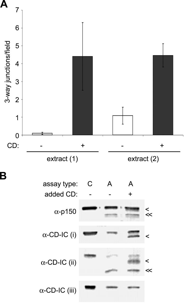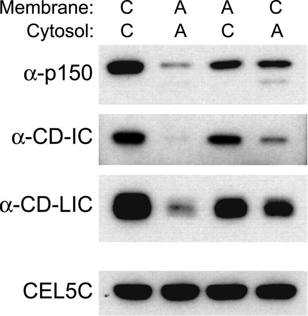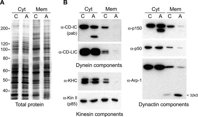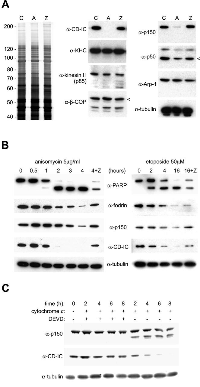 Cytoplasmic dynein is the major minus end-directed microtubule motor in animal cells, and associates with many of its cargoes in conjunction with the dynactin complex. Interaction between cytoplasmic dynein and dynactin is mediated by the binding of cytoplasmic dynein intermediate chains (CD-IC) to the dynactin subunit, p150(Glued). We have found that both CD-IC and p150(Glued) are cleaved by caspases during apoptosis in cultured mammalian cells and in Xenopus egg extracts. Xenopus CD-IC is rapidly cleaved at a conserved aspartic acid residue adjacent to its NH(2)-terminal p150(Glued) binding domain, resulting in loss of the otherwise intact cytoplasmic dynein complex from membranes. Cleavage of CD-IC and p150(Glued) in apoptotic Xenopus egg extracts causes the cessation of cytoplasmic dynein--driven endoplasmic reticulum movement. Motility of apoptotic membranes is restored by recruitment of intact cytoplasmic dynein and dynactin from control cytosol, or from apoptotic cytosol supplemented with purified cytoplasmic dynein--dynactin, demonstrating the dynamic nature of the association of cytoplasmic dynein and dynactin with their membrane cargo.