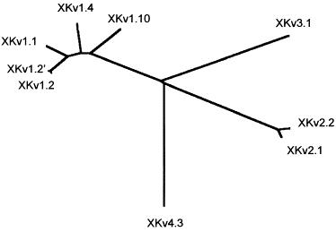Fig. 4. Relationship of XKv1.10 to other Xenopus Kv channels. The predicted amino acid sequences between the T1 and S6 domains from the known Xenopus K+ channels were aligned using Clustalw, and an unrooted phenogram was constructed using the MEGA2 software package. The distance between two K+ channels represents extent of divergence.