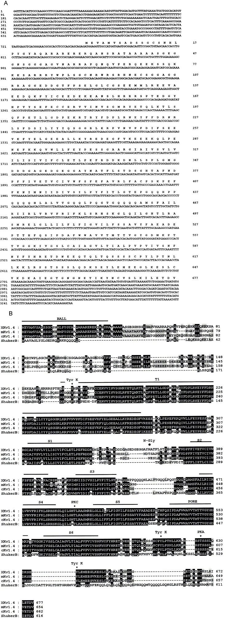 Fig. 2. (A) Nucleotide sequence of the XKv1.4 cDNA (accession #AF323750) isolated from muscle, and the deduced amino acid sequence. The position of the nucleotide is indicated on the left, and amino acid on the right. (B) Alignment of deduced amino sequence from XKv1.4 with mouse Kv1.4 (mKv1.4), chick Kv1.4 (cKv1.4) and the Shaker B channel. Conserved residues are shaded in black, similar residues are shaded in grey. The position of the ball domain, tetramerization domain (T1), membrane spanning domains (S1–S6) and pore domains are indicated. Putative N-linked glycosylation site in the S1–S2 linker and phosphorylation sites by protein kinase C (PKC), protein kinase A (PKA) and tyrosine kinase (Tyr-K) are indicated.