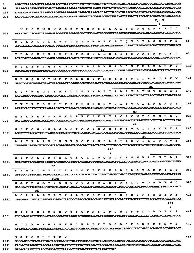 Fig. 3. Nucleotide sequence of the XKv1.10 cDNA (accession #AF323751), and the deduced amino acid sequence. The position of the tetramerization domain (T1), membrane spanning domains (S1–S6) and pore domain are indicated. Potential phosphorylation sites by protein kinase C (PKC) and protein kinase A (PKA) are indicated.