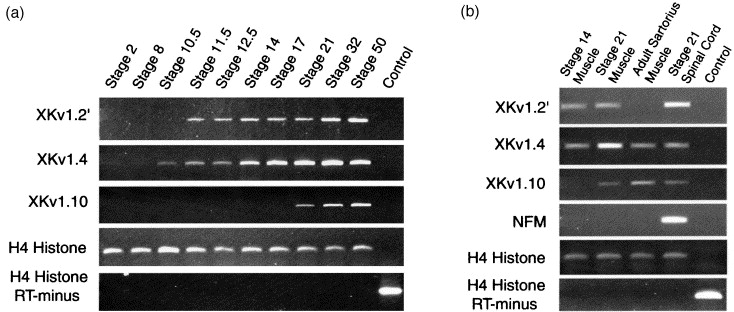 Fig. 5. (A) Developmental expression of XKv1.2â², XKv1.4 and XKv1.10 in whole embryos. cDNA was prepared from whole embryos at stages 2, 8, 10.5,11.5, 12.5, 14, 17, 21, 32 and 50 and XKv1.2â², XKv1.4 and XKv1.10 expression was assessed using specific primers as described in the Materials and methods. (B) Expression of XKv1.2â², XKv1.4 and XKv1.10 in muscle and nerve. cDNA was prepared from the muscle of stage 14 and 21 embryos, adult sartorious muscle and stage 21 spinal cord. Expression of XKv1.2â², XKv1.4 and XKv1.10 RNA was assessed using specific primers as above. Additional RTâPCR with primers specific for medium weight neurofilament (NFM) was carried out to demonstrate that the muscle RNA sample was uncontaminated by nerve. (Controls) RTâPCR with primers for H4 histone was carried out with each of the cDNA preparations as a positive control. The control lane at the right of the figure for the Kv1.2â², Kv1.4, Kv1.10 and H4 reaction contained no template. The H4 primers were used with RT-minus template to ensure there was no genomic DNA and the control lane for this series contained stage 50 cDNA.