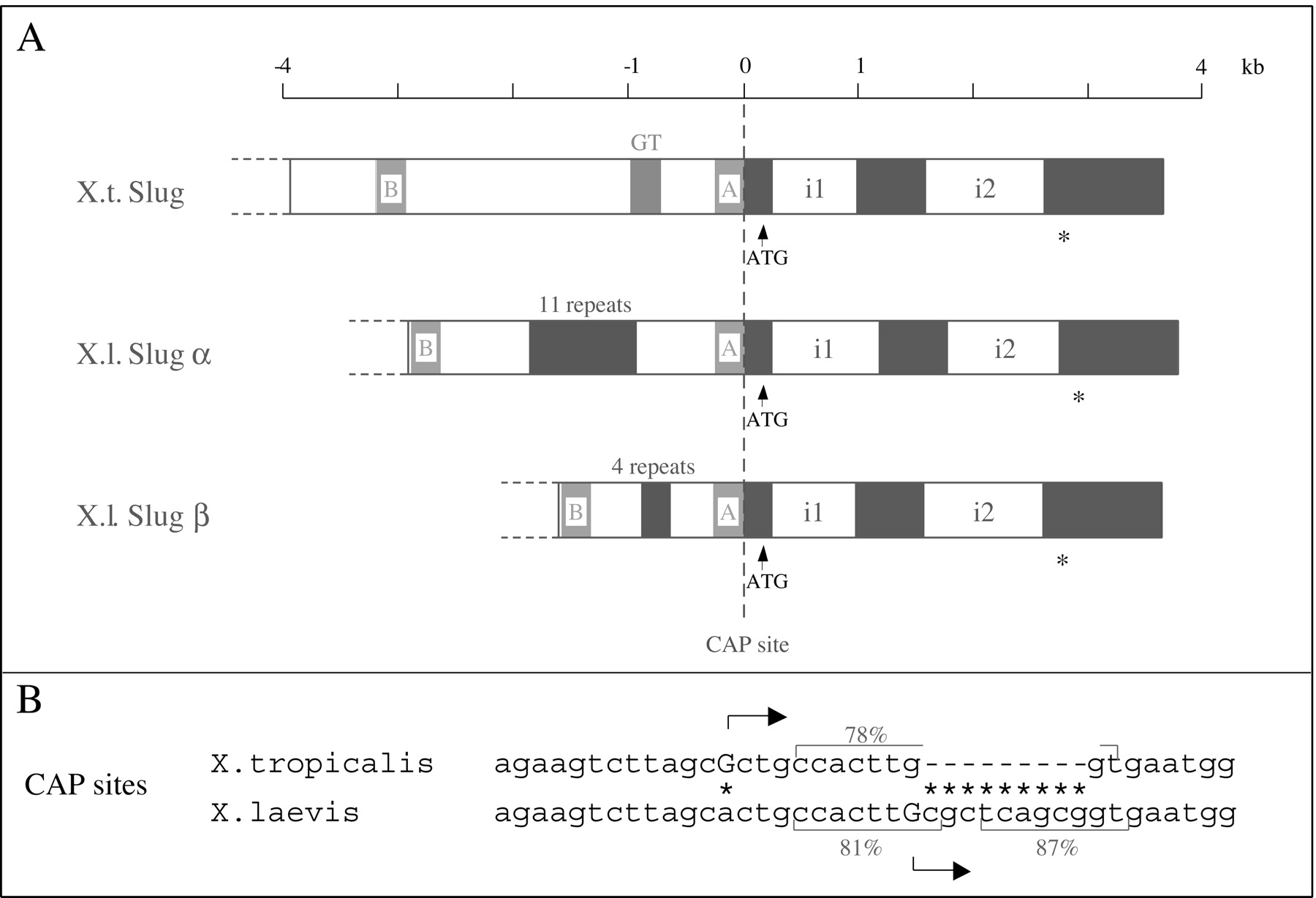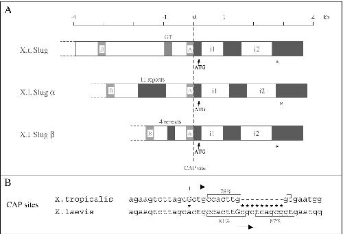 FIG. 1. The X. tropicalis slug promoter is inefficient in X. laevis embryos. A, constructs containing different fragments of the X. tropicalis