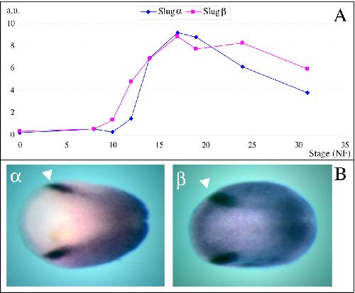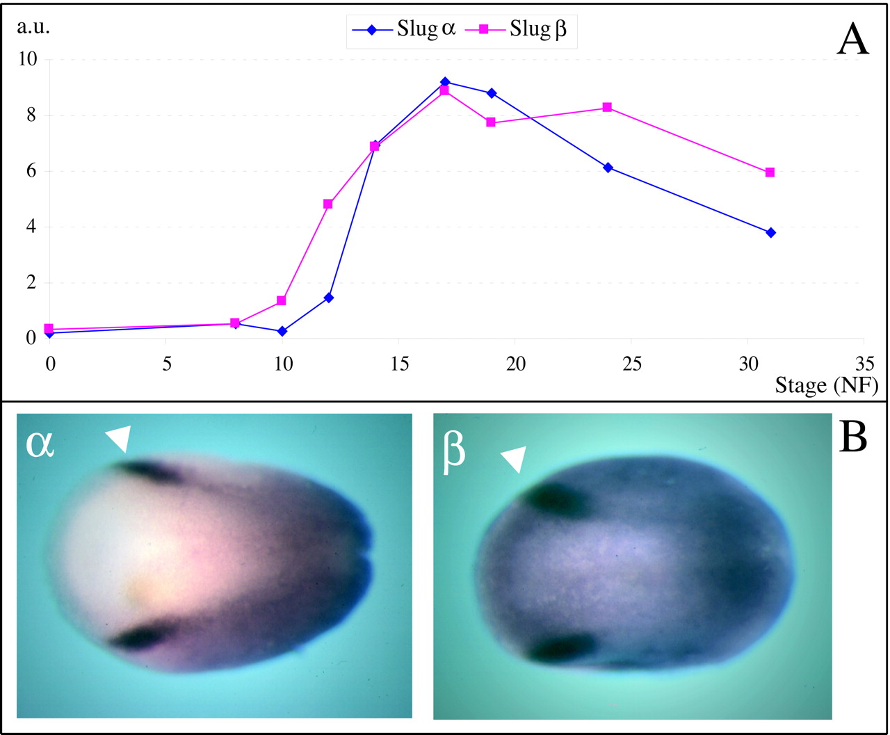 indicating that the X. tropicalis slug promoter is inefficient in X. laevis embryos. a.u., arbitrary units; u, uninjected; St, stage. |