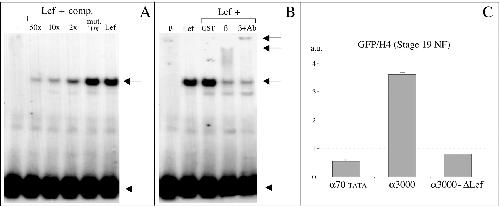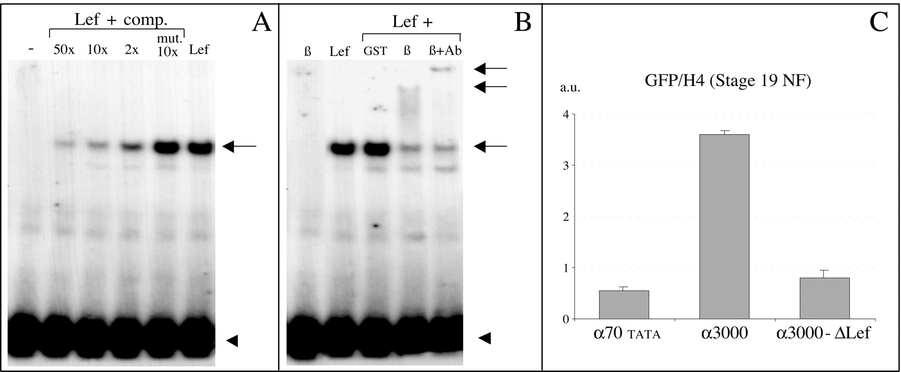 shift assay with a fragment of region B including the predicted Lef/ -catenin-binding site as a probe. Purified Lef-1 bound to this fragment (arrow).