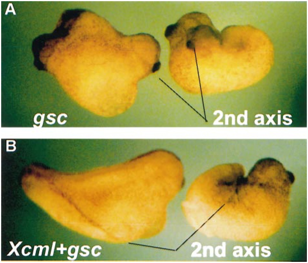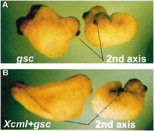 with head structures (eyes, cement glands). (B) Coinjection of Xcml