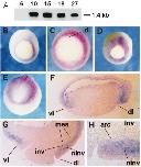 FIG. 3. Expression of Xcml RNA during Xenopus development. (A) Temporal expression of Xcml mRNA studied by Northern blot analysis of embryo poly(A)1 RNA, developmental stages are indicated on top. (B) Spatial pattern of Xcml mRNA expression revealed by whole-mount in situ hybridization with Xcml antisense digoxigenin-labeled RNA probe, stages 10.5 (B), 11 (C), 12 (D), and 16 (E, posterior view shown). Note that Xcml is expressed in the area around the closing blastopore during the entire gastrulation stage. Soon after involution, cells cease to express Xcml, as visible on sagittal sections of Xcml-hybridized embryos at the stages 10.5 (F) and 12 (G, H). (H) The dorsal lip viewed with higher magnification. Indicated are dorsal lip (dl); ventral lip (vl), archenteron (arc), noninvoluting deep cells of neuroectoderm (ninv), involuted (inv) mesodermal cells, and deep layer of mesoderm (mes).