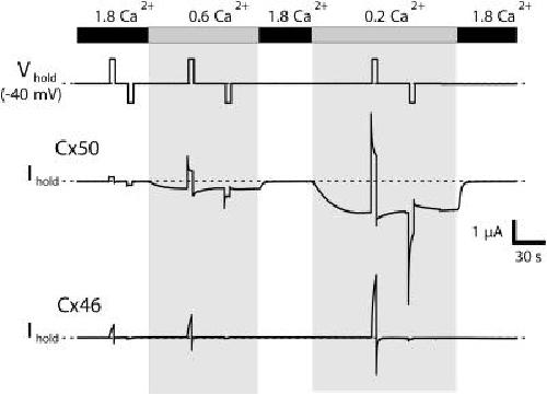 Figure 1. Membrane currents in Xenopus oocytes expressing Cx50 (middle) and Cx46 (bottom) respond differently to changes in external calcium. MND96 solutions with external Ca2+ concentrations of 1.8, 0.6, and 0.2 mM were applied to oocytes voltage clamped at −40 mV (Vhold). A pair of 5-s voltage steps, one depolarizing to +50 mV and one hyperpolarizing to −110 mV were applied at each Ca2+ concentration. Reducing external Ca2+ led to the development of a progressively larger inward current at Vhold in Cx50-expressing oocytes that was accompanied by progressively larger currents in response to both polarities of applied voltage steps. In contrast, little or no change in current at Vhold or in response to hyperpolarizing voltage steps were observed in Cx46-expressing oocytes upon reducing external Ca2+. However, currents elicited by the depolarizing steps were progressively larger as Ca2+ was reduced, consistent with the effects of Ca2+ previously described (Ebihara and Steiner, 1993).