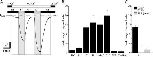 Figure 2. External monovalent cations strongly potentiate Cx50, but not Cx46, hemichannel currents. (A) Membrane currents were monitored in a Cx50-expressing oocyte voltage clamped at −40 mV. Reduction of Ca2+ from 1.8 mM to 0.2 mM in a Na+ solution promoted opening of Cx50 hemichannels evident by the development of an inward current. Equimolar replacement of Na+ with K+ or Cs+ (gray bars) in the continued presence of 0.2 mM Ca2+ caused a large increase in the amplitude of the inward current at −40 mV, an effect that was reversible upon switching back to Na+. (B) Bar graph summarizing the effect of replacing external Na+ with a variety of monovalent cations on Cx50 hemichannel currents. K+, Rb+, NH4+, and Cs+, but not TEA+, Li+, and choline, caused a robust potentiation in current. Bars represent the means ± SEM of the fold change caused by each monovalent cation (n ranged from 4 to 15). Mean values in K+ and Cs+ were significantly different (P < 0.05). (C) Cx46 hemichannels were only moderately affected by replacing external Na+ with K+. Bar graph shows a comparison of the increase in Cx46 (white bars) and Cx50 (solid bars) hemichannel currents upon replacing external Na+ with K+. Because Cx46 activates only at positive voltages, current amplitudes were measured at the ends of 5-s depolarizing voltage steps to +50 mV. Such changes were not observed in uninjected oocytes (gray bars). Each bar represents the mean ± SEM of six oocytes.