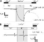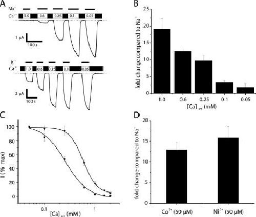 Figure 4. Potentiation by K+ is dependent on external Ca2+. (A) Example of recordings of membrane currents in a Cx50-expressing oocyte voltage clamped at −40 mV over a range of Ca2+ concentrations in NaCl and KCl. For each series, the oocyte was placed in 100 mM NaCl containing 2 mM Ca2+ and sequentially exposed to 100 mM NaCl (top panel, dashes) or 100 mM KCl (bottom panel, dashes) containing Ca2+ concentrations of (in mM) 1.0, 0.6, 0.25, 0.1, and 0.05 (open bars). Between each exposure, oocytes were returned to 100 NaCl containing 2 mM Ca2+ (filled bars). Saturation of the effect of Ca2+ was achieved at a higher external Ca2+ concentration in K+. (B) Bar graph showing the magnitude of potentiation of Cx50 hemichannel currents upon replacement of external Na+ with K+ at different Ca2+ concentrations. The effect of external K+ was markedly reduced at the lower end of the Ca2+ concentration range examined. Current magnitudes due to the differences in mobility between Na+ and K+ are not corrected. Each bar represents the mean ± SEM of 6–15 oocytes. (C) Concentration response curves for Ca2+ inhibition of Cx50 hemichannel currents in external Na+ (squares) and K+ (inverted triangles) solutions. For Na+ and K+, current amplitudes at each Ca2+ concentration were normalized to the responses obtained at 0.05 mM Ca2+ in Na+ and K+, respectively. Solid lines are fits of the data to the Hill equation of the form Normalized I = Kdn/(Kdn + [Ca2+]n. Kd and n values were 259 μM and 2.2 in Na+ and 580 μM and 3.2 in K+. (D) Bar graph showing that the inhibition of Cx50 hemichannel currents by other divalent cations, Ni2+ and Co2+, is also affected by replacement of Na+ with K+. Each bar represents the mean ± SEM of three to four oocytes.