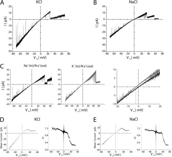 Figure 3. Unitary conductance and gating properties of Cx50 hemichannels do not differ in NaCl or KCl solutions in the absence of Ca2+. (A and B) Single Cx50 hemichannel currents obtained with 8-s voltage ramps from −70 to 70 mV applied to excised patches in symmetric KCl (A) or NaCl (B) solutions each containing 1 mM Ca2+/5 mM EGTA to maintain the free Ca2+ concentration <10−7 M. (C) Single Cx50 hemichannel currents obtained with 8-s voltage ramps from −65 to 65 mV applied to excised inside-out patches in symmetric NaCl solutions (left) or asymmetric KCl(in)/NaCl(out) solutions (center). Recordings are from the same patch. Segments of the I-V relationships are expanded to show the small shift in Erev −2.6 mV (right). (D and E) Conductance–voltage (G-V) relationships of Cx50 hemichannels (shown on right in D and E) constructed from ensemble (n = 20) averaged currents (shown on left in D and E) in response to ±70 mV, 8-s voltage ramps applied to cell attached patches. Pipette solutions containing KCl (D) or NaCl (E) were the same as in A and B.