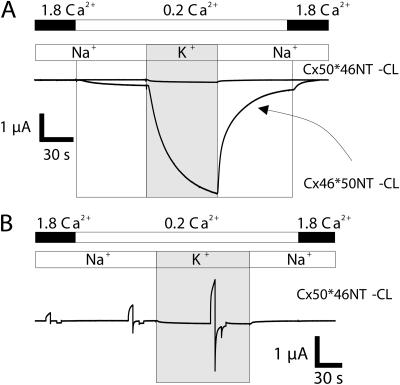 Figure 5. The difference in the sensitivity of Cx46 and Cx50 hemichannels to external K+ resides in the NH2-terminal half. (A) Shown are hemichannel currents upon replacing external Na+ with K+ in oocytes expressing Cx46*50NT-CL and Cx50*46NT-CL chimeric hemichannels. Oocytes were voltage clamped at −40 mV. Currents in oocytes expressing Cx46*50NT-CL, in which Cx46 sequence from the NT through the CL was replaced with Cx50, were strongly potentiated, much like Cx50, when Na+ was replaced with K+. The reciprocal chimera, Cx50*46NT-CL, was similar to Cx46 in being largely insensitive to external K+, except for a small shift in the baseline current that was also observed in uninjected oocytes. (B) Hemichannel currents in oocytes expressing Cx50*46NT-CL in response to hyperpolarizing and depolarizing pulses to −110 and +50 mV, respectively, applied from holding potential of −40 mV in Na+- and K+-containing external solutions. Membrane currents in Cx50*46NT-CL–expressing oocytes qualitative resemble those in Cx46-expressing oocytes and show an increase in external K+ similar to that of Cx46 hemichannels.