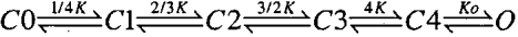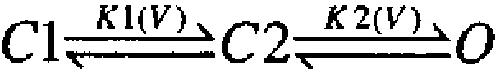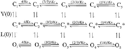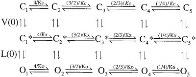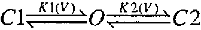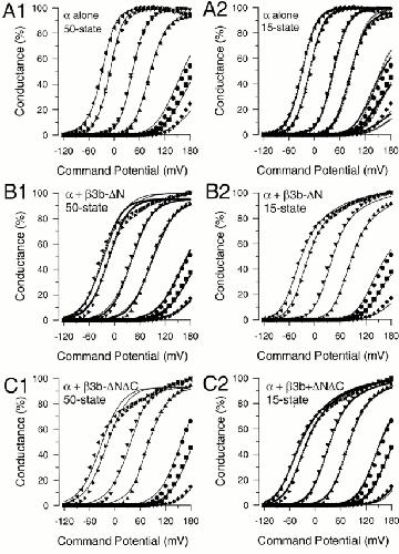 Figure 9. Coupling of voltage-dependent charge movement of closed states to changes in Ca2+ binding affinity can account for the unusual shape of the α + β3b-ΔN G-V curves. In A1, points show G-V curves arising from α alone while the lines show the best fit with the 50-state model () in which voltage sensor movement does not affect Ca2+ affinity. Best fit values are given in Table . In A2, defined by the 15-state model (Fig. 1) was used to fit the α alone G-V curves. With all parameters not constrained, the value for Kx was indeterminate. Fixing Kx near the value for Kc yielded the fit shown by the solid line. In an alternative fit (dotted line), it was assumed that the charge moved during voltage-sensor movement (Q1) and that during the closed-to-open transition (Q2) were identical to that revealed by the fit to G-V curves arising from α + β3b-ΔN. In this case, the value for Kx converged to a value near that for Kc. Best fit values are given in Table . The fit corresponding to the line with open circles resulted when all parameters except Kc and Kx were constrained to values that resulted from fitting the α + β3b-ΔN curves in B2. In B1, G-V curves resulting from α + β3b-ΔN were fit with (50-state model). Two fits are shown: one in which the peak conductance was constrained to be 100%, and the other with all parameters unconstrained. In B2, G-V curves resulting from α + β3b-ΔN were fit with (15-state model), with all values unconstrained. In comparison to the best fit for α alone, values for Kx approach that for Ko. In C1, mean G-V values for α + β3b-ΔNΔC were fit with with all values unconstrained. In C2, G-V values for α + β3b-ΔNΔC were fit with , in one case with all values unconstrained (dotted line) and the other (solid line) with values for V(0) and L(0) constrained to those obtained in the fit to the α + β3b-ΔN data. |