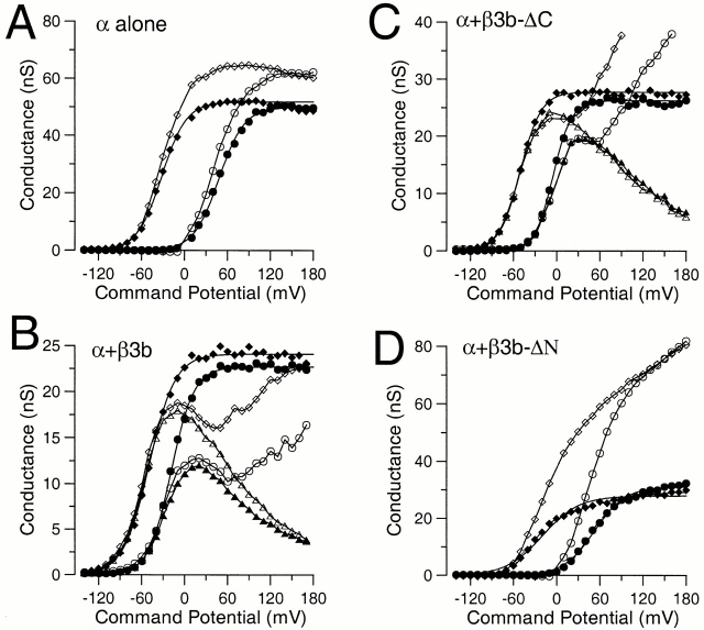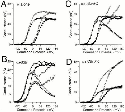Figure 2. Properties of conductance-voltage curves measured for different β3b constructs. In A, conductance determined either from peak current or tail current is plotted as a function of activation potential at either 10 μM Ca2+ (•, tail; ○, peak) or 300 μM Ca2+ (♦, tail; ⋄, peak) for a representative patch expressing α alone. In each panel, the solid lines over the tail current G-Vs are the best fit of (see materials and methods), while lines over peak or steady-state current G-Vs simply connect the points. At 10 μM, V0.5 = 48.3 mV, with k = 17.7 mV; at 300 μM, V0.5 = −31.4 mV, with k = 17.2 mV. In B, both peak current and tail current G-V curves (symbols as in A) are plotted for α + β3b currents, along with the steady-state conductance (▴, 300 μM; ▵, 10 μM) determined at the end of each activation step. For tail current G-V curves, at 10 μM, V0.5 = −18.6 mV, with k = 15.9 mV; at 300 μM, V0.5 = −49.3 mV, with k = 18.1 mV. In C, peak, tail, and steady-state G-V curves (symbols as in A and B) are plotted as in B but for α + β3b-ΔC currents. At 10 μM, V0.5 = −4.9.1 mV, with k = 12.8 mV; at 300 μM, V0.5 = −50.6 mV, with k = 14.7 mV. In D, peak and tail current G-V curves (symbols as in A) are plotted for α + β3b-ΔN currents. For tail currents, a fit of yielded, at 10 μM, V0.5 = 52.3 mV, with k = 21.4 mV; and, at 300 μM, V0.5 = −19.3 mV, with k = 25.2 mV. A function with two Boltzmann terms () better fit the tail current G-V curves. For 10 μM, V10.5 = 42.0 mV (k1 = 15.7 mV) and V20.5 = 108.0 (k2= 27.0 mV) with Gmax1 contributing 72.8%. For 300 μM, V10.5 = −34.9 mV (k1 = 14.6 nmV) and V20.5 = 50.4 (k2= 34.2 mV) with Gmax1 contributing 67.4%. |