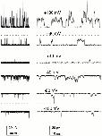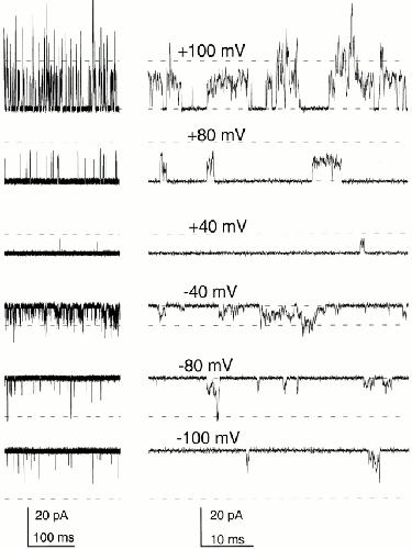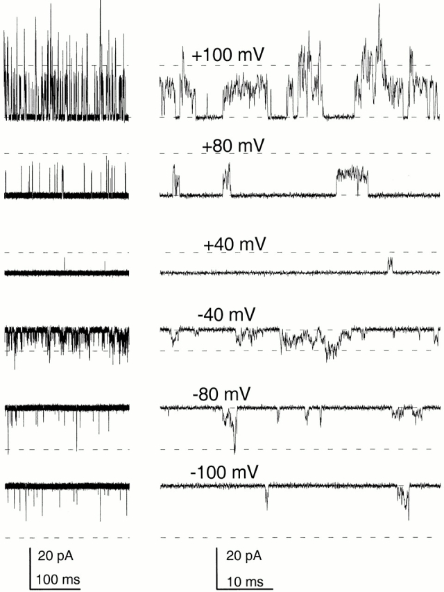 Figure 5. Channel openings resulting from α + β3b-ΔNΔC channels exhibit residual blocking behavior and an apparent nonlinearity in the average single-channel current level. Traces in each row show a lower and higher time base example of channel openings in an inside-out patch containing multiple α + β3b-ΔNΔC channels. Voltages are as indicated. At +100, +80, and +40 mV, the patch was bathed with 0 Ca2+, whereas at −40, −80, and −100 mV, the patch was bathed with 10 μM Ca2+. The dotted lines indicate the current level characteristic of α subunits alone, ∼250 pS. Even at +100 mV, α + β3b-ΔNΔC channels exhibit a flickery behavior, suggestive that a rapid blocking process is still present. For any individual channel burst, definition of an open level is unclear. |