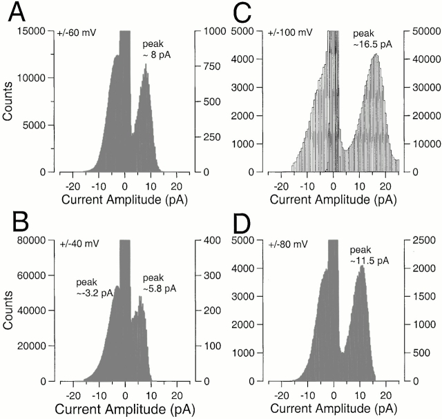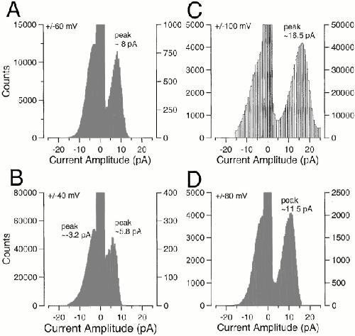 Figure 6. Asymmetry of single-channel current amplitude distributions for α + β3b-ΔNΔC currents. Total amplitude histograms were generated from the records obtained from the patch used in Fig. 5. Amplitude histograms at symmetric voltages were scaled so that the bins with maximal counts were comparable for both inward and outward currents. The histograms at symmetric voltages were then overlaid to allow comparison of the current values during periods of open channel activity. In A, total amplitude histograms are compared at +60 and −60 mV. At +60 mV, a clear peak at ∼8 pA is observed, whereas at −60 mV current values show a hint of a peak ∼3–4 pA, with a strong skewing. In B, amplitude histograms at ±40 mV are compared with peaks at −3.2 pA (−40 mV) and +5.8 mV (+40 mV). In C, amplitude histograms at ±100 mV are compared with a peak for +100 mV at 16.5 pA and no clear peak at −100 mV. In D, amplitude histograms are compared at +80 and −80 mV, with a peak at +11.5 pA for +80 mV and no clear peak at −80 mV. |