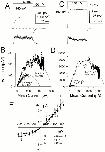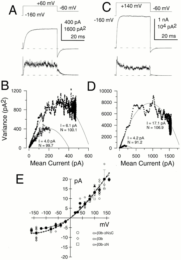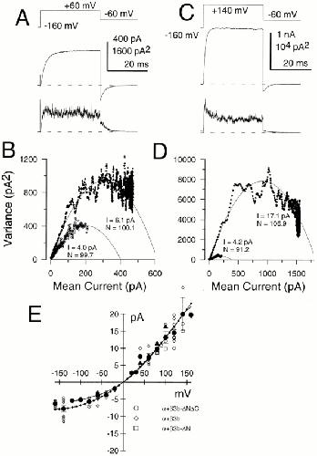 Figure 7. Ensemble variance analysis reveals nonlinearity in single-channel current estimates. In A, the indicated voltage protocol was used to repeatedly activate α + β3b-ΔNΔC currents with 10 μM Ca2+. The top current trace shows the average current from 75 sweeps, while the bottom trace shows the variance of all current values around the mean. In B, the current variance was plotted as a function of mean current at +60 mV (♦) and during repolarization to −60 mV (○). The initial slope of the variance versus mean relationship is steeper at +60 mV, indicative of a larger single-channel current amplitude. The solid lines are fits of in the materials and methods, where N and i are the fitted values for number of channels and single-channel current, respectively. At +60 mV, N = 100.1 and i = 6.1 pA, whereas at −60 mV, N = 99.7 and i = 4.0 pA. In C, mean current and variance determined for 90 sweeps are shown for the same patch with currents activated by a step to +140 mV with 10 μM Ca2+. In D, at +140 mV (♦), N = 106.9 and i = 17.1, whereas, at −60 mV (○), N = 91.2 with i = 4.2 pA. Currents were sampled at 5 μs per point at a bandwidth of 10 kHz. At +140 mV, the ensemble variance analysis would suggest that average open probability for these channels at 10 μM Ca2+ was 0.85, whereas at +60 mV, the average open probability was 0.79. These values are generally consistent with the near maximal activation of conductance observed in Fig. 3 D for the α + β3b-ΔN currents at +60 mV. In E, estimates of average open channel current obtained by different methods are plotted as a function of voltage. Open symbols correspond to individual ensemble variance analysis estimates. Values were obtained from α + β3b-ΔNΔC (○), α + β3b (⋄), and α + β3b-ΔN (□) currents, with no obvious differences among constructs. Mean values (•, and SD) for all variance analysis estimates for the three constructs were also determined at each potential. Mean values were calculated based on 2–16 estimates at each potential. The plot also includes estimates (▴) of single-channel current amplitude from the amplitude histograms shown in Fig. 6. The solid line is an instantaneous I-V curve for the α + β3b-ΔN currents (see Fig. 9 A in Lingle et al. 2001, in this issue) with the values normalized to the single-channel current value at +100 mV. The line with diamonds corresponds to the function: I(V) = V · G/(1 + K(0)exp−zFV/RT), with G = 173 pS, K(0) = 0.7 and z = 0.2, suggesting a limiting single-channel conductance of 173 pS. |