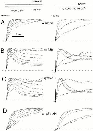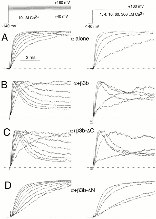 Figure 10. Normalized current activation time course as a function of voltage or Ca2+ for each β3b construct. In A, on the left, currents resulting from expression of α alone in an inside-out patch were activated at 10 μM with the indicated voltage-protocol. Each current was fit with a single exponential function, and the currents were then normalized to the maximal current activated at each command potential. On the right, currents were activated at +100 mV with 1, 4, 10, 60, and 300 μM Ca2+. Currents were again normalized to the maximal current amplitude activated at the command potential. In B, similar normalized currents are shown for α + β3b. In C, normalized currents are shown for α + β3b-ΔC. These appear essentially identical to those for α + β3b. In D, normalized currents are shown for α + β3b-ΔN. Even at the strongest activation conditions (+180, 10 μM Ca2+ on the left and +100 mV, 300 μM Ca2+ on the right), the α + β3b-ΔN currents activate more slowly than any of the other constructs. |