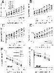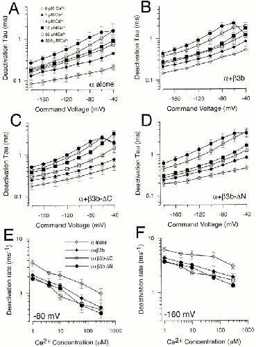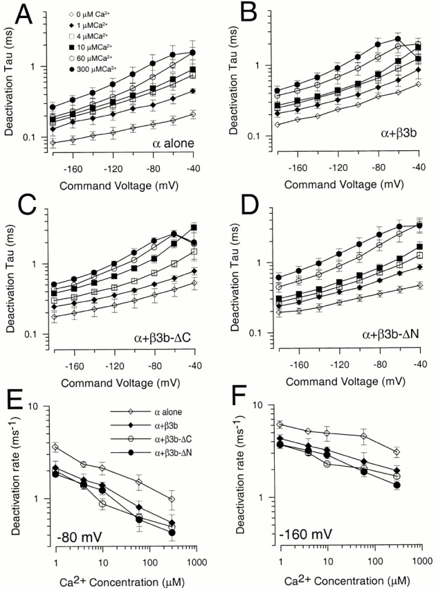 Figure 13. Comparison of deactivation time constants for different β3b constructs. In A, deactivation time constants (τd) obtained from single exponential fits to the tail current time course (Fig. 7) are plotted as a function of repolarization potential for currents from α subunit alone for 0 (⋄), 1 (♦), 4 (□), 10 (▪), 60 (○), and 300 (•) μM. In B, τd is plotted as a function of voltage for α + β3b currents with symbols as in A. In C, τd is plotted as a function of voltage for α + β3b-ΔC currents. In D, τd is plotted as a function of voltage for α + β3b-ΔN currents. In E, the deactivation rate measured at −80 mV is plotted as a function of Ca2+ for each construct (α, ⋄; α + β3b, ♦; α + β3b-ΔC, ○; and α + β3b-ΔN, •). In F, the deactivation rate measured at −160 mV is plotted as a function of Ca2+ with symbols as in E. Current deactivation for α alone is ∼1.5–2-fold faster than for currents resulting from any β3b construct. |