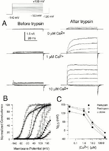 Figure 15. Removal of inactivation by trypsin slows the time to peak for activation of current, but has little effect on deactivation. In A, traces on the left show α + β3b currents for a patch activated with 10 μM Ca2+ by a step to +40 mV before and after trypsin application. At +40 mV with 10 μM Ca2+, there is no detectable time-dependent inactivation but just current rectification. On the right, the normalized currents are overlaid to show the faster apparent activation before trypsin-mediated removal of inactivation. In B, traces on the left show currents activated with 1 μM Ca2+ at +100 mV. The normalized currents on the right show a markedly faster time-to-peak of currents before trypsin application. In C, time constants of current activation were plotted as a function of command voltage for currents activated with either 1 or 10 μM Ca2+ either before (○, 1 μM; ⋄, 10 μM) or after (•, 1 μM; ♦, 10 μM) trypsin-mediated removal of inactivation. With inactivation intact, there is a faster apparent rate of current activation at low and moderate [Ca2+]. Points are mean and SD for three patches. |