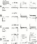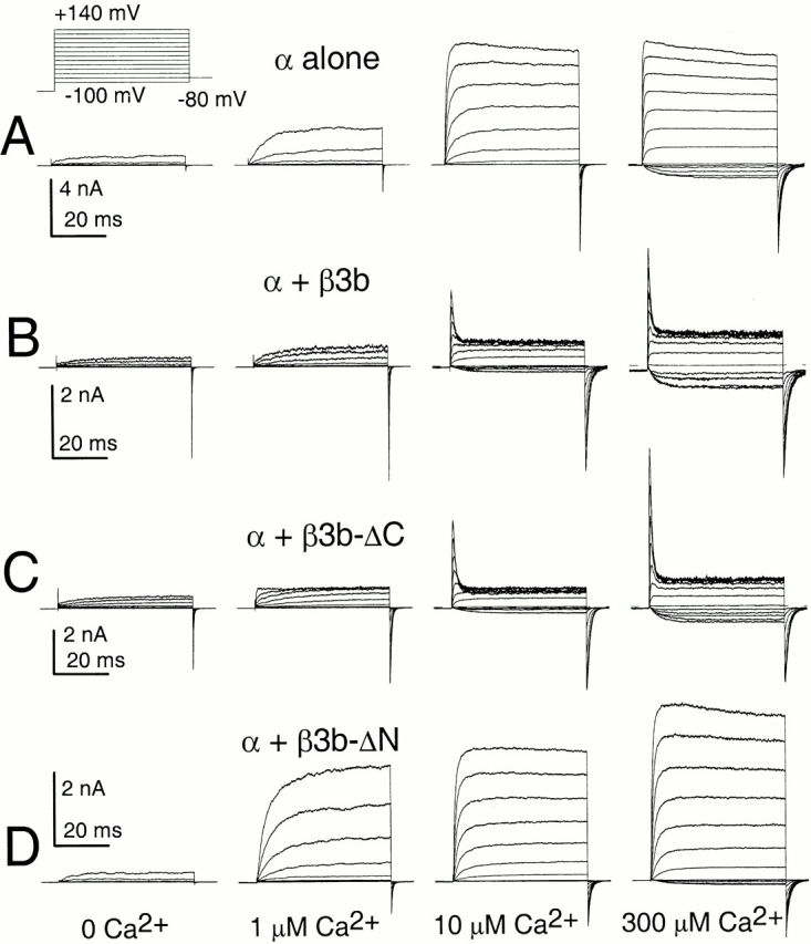 Figure 1. Activation of channels resulting from β3b constructs with or without the NH2- and COOH termini. In A, traces show currents obtained from an inside-out patch from a Xenopus oocyte injected with cRNA encoding the mouse Slo α subunit alone. Channels were activated by voltage steps from −100 to +180 mV after 20 ms at −140 mV; from left to right, panels show currents activated with 0, 1, 10, or 300 μM Ca2+. The voltage protocol is shown on the top. In B, traces show currents resulting from coexpression of α + β3b under conditions identical to those in A. In C, traces show currents resulting from α + β3b-ΔC coexpression, whereas, in D, currents reflect α + β3b-ΔN coexpression. |