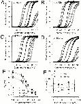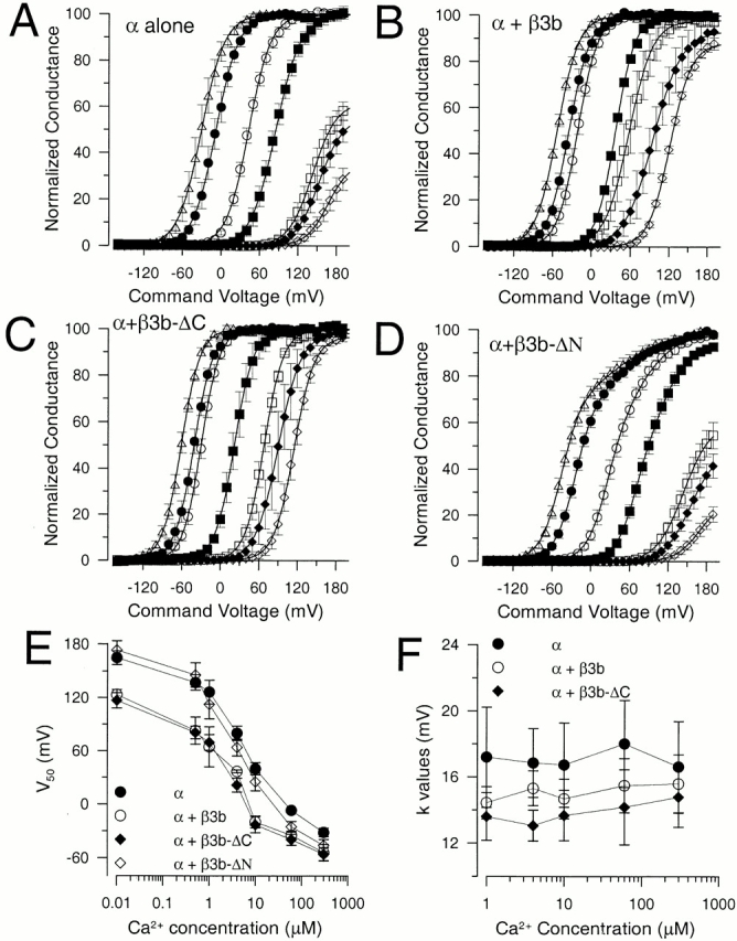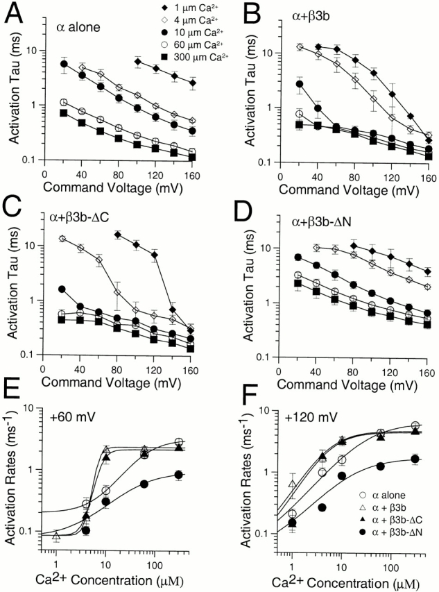 Figure 11. Comparison of activation time constants for α, α + β3b, α + β3b-ΔC, and α + β3b-ΔN. In A, the time constant of activation, τa, for currents arising from expression of the α subunit alone is plotted as a function of command potentials for 1 (♦), 4 (⋄), 10 (•), 60 (○), and 300 (▪) μM Ca2+ for 5–7 patches at each [Ca2+]. Error bars indicate standard deviation. In B, τa is plotted for α + β3b currents. Note the apparent faster time constant for α + β3b currents relative to α alone. Symbols in B–D are identical to those in A. In C, τa is plotted for α + β3b-ΔC currents, showing the similarity with α + β3b currents. In D, τa is plotted for α + β3b-ΔN currents. At all potentials and Ca2+, α + β3b-ΔN currents appear to activate more slowly than those arising from α alone. In E, apparent activation rates at +60 mV were calculated and plotted as a function of Ca2+ for each of the four sets of currents (α, ○; α + β3b, ▵; α + β3b-ΔC, ▴; and α + β3b-ΔN, •). Solid lines represent a fit of k(Ca) = k(0) 1 kmax/(1 + ([Ca2+]/K)n) where k(0) is the activation rate at 0 Ca2+, kmax is the maximal Ca2+-dependent increase in activation rate, K is the concentration of half effect, and n is the Hill coefficient. For α, α + β3b, α + β3b-ΔC, and α + β3b-ΔN, respectively, the maximal k(Ca) was 3.24, 2.34, 2.18, and 0.96 ms−1, K was 54.7, 6.7, 7.8, and 37.8 μM, and n was 1.4, 6.3, 4.5, and 1.01. Confidence limits on estimates of K and n were large, but at +60 mV the steeper Ca2+ dependence of the apparent activation rate for α + β3b and α + β3b-ΔC currents is clear. In F, apparent activation rates are plotted as in E but for currents measured at +120 mV. For α, α + β3b, α + β3b-ΔC, and α + β3b-ΔN, the maximal k(Ca) was 6.6, 4.9, 4.6, and 1.8 ms−1, respectively, K was 29.1, 5.5, 5.6, and 15.6, respectively, and n was 0.99, 1.33, 1.39, and 0.99, respectively. At +120 mV, the relatively faster intrinsic rate of activation of the β3b and β3b-ΔC constructs compared with +60 mV reduces the effect of inactivation on the apparent activation rate. Note that at both +60 and +120 mV, the limiting maximal k(Ca) for α + β3b-ΔN currents is less than that for any of the other constructs. |
