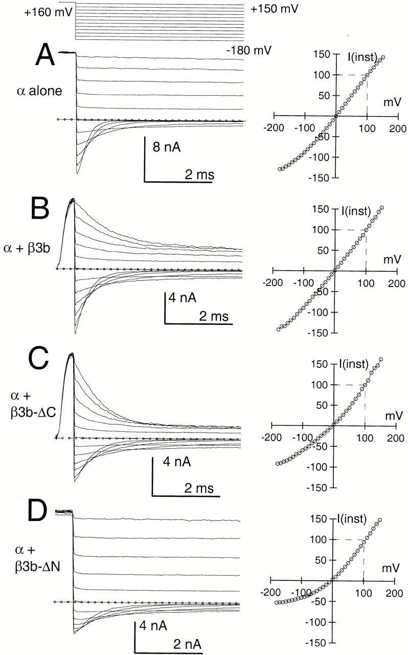 Figure 4. The β3b subunit results in a novel outward instantaneous current rectification that is most pronounced in the absence of the NH2 terminus. In A, traces on the left show currents resulting from α alone, activated by a voltage-step to +160 mV in the presence of 300 μM Ca2+, followed by repolarization to potentials between +150 mV and –180 mV. Measurement of current levels 100 μs after the nominal imposition of the repolarizing voltage step resulted in the plot on the right, in which current amplitudes were normalized to the amplitude measured at +100 mV. In B, traces are currents resulting from expression of α + β3b subunits. Here, the instantaneous I-V is largely linear over the entire range, (but see Lingle et al. 2001, in this issue). In C, traces show currents resulting from α + β3b-ΔC subunits. The instantaneous I-V shows a small outward rectification. We attribute the differences in the examples in B and C primarily to patch-to-patch variability in the relative rates of activation and inactivation at a given set of activation conditions. In D, traces show currents resulting from α + β3b-ΔN. The instantaneous I-V curve exhibits marked outward rectification with the conductance at +100 mV being at least twofold greater than at −100 mV. |