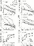Figure 8. Comparison of families of peak and tail current G-V curves for both α + β3b-ΔN and α + β3b-ΔNΔC. In A, normalized G-V curves obtained from α + β3b-ΔN tail (A1; same as Fig. 3D) and peak (A2) currents are plotted for 0 (♦, ⋄), 0.5 (▪, □), 1 (•, ○), 4 (▴, ▵), 10 (▾, ▿), 60 (▸, ▹), and 300 (◂, ◃) μM Ca2+. Error bars are SEM for seven patches. Lines with small dotted circles represent fits of to each G-V curve, whereas a solid line shows the fit of , and 300 μM Ca2+. In B, G-V curves obtained from α + β3b-ΔNΔC tail (B1) and peak (B2) currents (4 patches) are plotted along with the fits of and . In C, normalized peak (open symbols) and tail current G-V curves for α + β3b-ΔN are compared for 0 (♦, ⋄), 1 (▪, □), 10 (•, ○), and 300 μM Ca2+ (▴, ▵). For each patch, the maximum tail current conductance was normalized to the maximum conductance estimated from the peak current. Error bars for the tail current estimates are larger here than in A because of additional variability in the relative amount of maximal tail to peak current conductance among patches. Fits of and to the peak current G-V curves are shown for 10 and 300 μM Ca2+ to emphasize that fails to describe the G-V curves at higher Ca2+. In D, relative amplitude of peak and tail current G-Vs are compared for α + β3b-ΔNΔC currents with symbols as in C. In E, the normalized peak (solid symbols) and tail current G-V curves for α + β3b-ΔN currents obtained at 10 and 300 μM Ca2+ are overlaid to emphasize the difference in shape between peak and tail G-V curves that is particularly pronounced at higher Ca2+. In F, a corrected tail current conductance (•, 10 μM Ca2+; ▪, 300 μM Ca2+) at each potential based on the measured tail current conductance and the nonlinearity of the instantaneous I-V curves (Fig. 7 E) was determined for α + β3b-ΔN currents. At each potential, tail current conductances (as in Fig. 7 E) were scaled by a factor defined by the idealized instantaneous I-V curve in Fig. 8, with the instantaneous conductance at −100 mV set to 1. Actual peak conductance values are also plotted (○, 10 μM; □, 300 μM). |