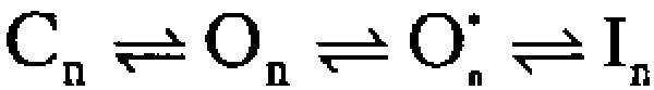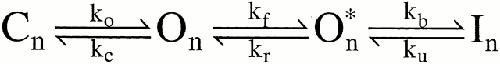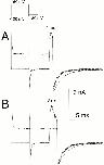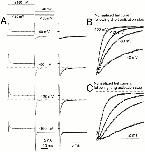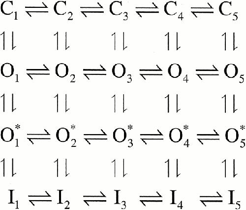 Figure 15. Fig. 2 predicts currents that exhibit properties similar to those observed for α + β3b currents. In A, Fig. 2 (with parameters in Table ), assuming 10 μM Ca2+, was used to simulate currents with the indicated protocol (as in Fig. 2). Tail currents were compared at either −80 mV (A1) or −160 mV (A2), after either a short (1 ms) or longer (10 ms) activation step. Single exponential fits to the decay phases yielded time constants of 1.23 and 1.24 ms, for the shorter and longer activation steps, respectively. In A2, tail current was elicited at −160 mV. Time constants of deactivation were 0.227 ms (longer step) and 0.221 ms. In B, a paired-pulse protocol (as in Fig. 10) was used to model the recovery from inactivation with Fig. 2 (values from Table ; 10 μM Ca2+). Points show each simulated value (10 μs). The tail current exhibits the rapid nonohmic unblocking, followed by a slower unblocking. After the shorter recovery steps (500 μs), a subsequent depolarization to +160 mV results in rapid reblock with only a small excess of current over the previous steady-state level of block. Longer recovery steps result in an increase in the initial amount of current observed during the step to +160 mV, even as the tail current at −80 mV decreases. For the transition rates between O* and I in Table , at short recovery times the step to +160 mV also results in a 10–20-μs rapid spike of current associated with the rapid reblocking of channels from O* to I. Currents were simulated at 10 μs per point, and the spike of current lasted 1–2 points. In C, the indicated protocol (as in Fig. 11) was used to simulate currents assuming 10 μM Ca2+. In the middle panel, a 100-μs recovery step to −120 mV preceded a subsequent step to potentials between −120 and +180 mV. In the bottom panel, a 500-μs step to −120 mV was used to produce recovery from inactivation. In D, the instantaneous I-V from the traces in C were determined by measuring current values 30 μs after the nominal end of the recovery steps. Values were normalized to current amplitudes at −100 mV. At 30 μs, the spike of reblocking observed in the simulated currents is complete. The I-V curve becomes more linear after the 500-μs recovery step (•), which is indicative of greater occupancy of On. Simulation frequency: 100 kHz. |