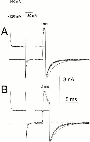 Figure 2. α + β3b currents rapidly recover from inactivation. Currents through α + β3b channels were activated in the presence of 10 μM Ca2+ by the voltage protocol shown on the top. Scale bars apply to the expanded time base traces displayed on the right. In A, traces compare tail currents after repolarization to −80 mV at the end of either a 1- or 40-ms step to +160 mV. The left traces show the complete current record, whereas the right-hand traces show the tail currents on an expanded time base. Despite the fact that outward current at the end of the 1-ms step to +160 is more than twice that at the end of the 40-ms step to +160 mV, maximal tail current amplitude after repolarization is actually larger in the latter case. Furthermore, the current decay time is markedly slower. For currents activated with the brief steps to +160 mV, symbols plot every twentieth digitized point. In B, tail currents at −80 mV are compared after either a 2-ms or a 40-ms step to +160 mV. The tail current amplitude is similar in both cases despite the fact that outward current at +160 mV differs markedly. |