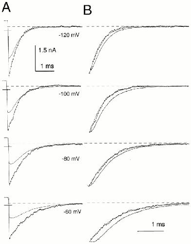 Figure 7. Trypsin removes the unblocking relaxation observed in α + β3b tail currents. In A, panels from top to bottom compare tail currents at the four indicated repolarization potentials, before and after (line with points) trypsin application. Despite the extensive unblocking that occurs during repolarization, the ability of trypsin to increase the tail current amplitude suggests that even at negative potentials some voltage-dependent block of channels persists. At −120 mV, tail current amplitudes before trypsin are ∼70% of those after trypsin application. For the traces after trypsin application, the points correspond to every fifth digitized value. The horizontal bars overlaid on the rising phase of the tail currents indicate the calculated level of tail current expected at the repolarization potential assuming an instantaneous ohmic step from the residual level of current at +160 mV. A small segment of the steady-state–inactivated current at +160 mV is shown for the traces before trypsin application. Filter, 10-kHz bandwidth; sampling period, 10 μs. In B, each pair of traces was normalized to the same peak amplitude. For the trace obtained before trypsin application, the deactivation time course was fit with the following two exponential function: A1 · exp(−t/τu) + A2 · exp(−t/τd) + offset. At −120, −100, −80, and −60 mV, the unblocking relaxations were 0.18, 0.13, 0.20, and 0.24 ms, respectively, whereas the subsequent deactivation time constants were 0.40, 0.57, 0.71, and 0.98 ms, respectively. After trypsin, a fit of A1 · exp(−t/τd) + C yielded time constants of 0.42, 0.52, 0.74, and 1.06 ms. |