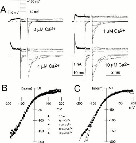 Figure 8. Properties of instantaneous current-voltage (I-V) curves following repolarization from a steady-state–inactivated condition. In A, currents were activated by the indicated voltage protocol at various Ca2+ (0, 1, 4, and 10 μM Ca2+). For all Ca2+, there is a large, immediate nonohmic increase in tail current indicative of rapid unblocking from inactivation. In B, the current was measured 100 μs after the nominal time of the repolarizing voltage step and normalized to the current measured with the step to −100 mV. The shape of the I-V curve is identical for all Ca2+. In C, the mean and standard deviation for the instantaneous I-V curve from five patches at 10 μM Ca2+ are plotted, along with the best fit of . For the fit with solid circles all values were unconstrained yielding Gmax = 30.5 ± 24.0; K2(0) = 51.7 ± 49.44 and Q2 = 0.154e ± 0.020e. For the fit with diamonds, Gmax was constrained to 2.0 with K2(0) = 2.27 ± 0.045 and Q2 = 0.209e ± 0.005e. For the open circles, Gmax was constrained to 1.0 with K2(0) = 0.504 ± 0.07 and Q2 = 0.341e ± 0.03e. |