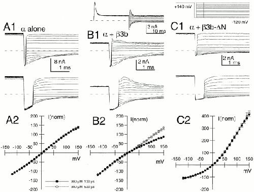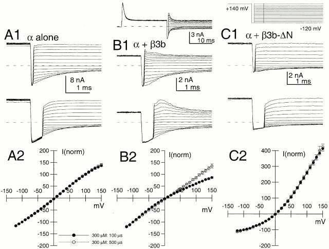 Figure 11. α + β3b channels pass through different open states during recovery from inactivation. Currents displayed in A–C were evoked with the portion of the voltage protocol shown above C. An example of the full current waveform (for α + β3b) is shown above B1. Steady-state current activation was achieved at +140 mV, and the patch was stepped to −120 mV for either 100 μs (top traces) or 500 μs (bottom traces) before a subsequent depolarization to potentials between −120 and +140 mV. In A1, traces show currents resulting from only α subunits activated with 300 μM Ca2+. The current amplitude was measured at a time point 80 μs after the nominal time of the final voltage step. In A2, instantaneous current amplitudes were normalized for five patches to current amplitudes elicited at +100 mV with 300 μM. At 300 μM Ca2+, current has decayed ∼25% more at 500 μs than at 100 μs. Similar normalized I-V curves were obtained with 10 μM Ca2+. In all cases, the instantaneous I-V curve is essentially linear from −100 through +100 mV. In B1, similar tests were performed on α + β3b currents with 300 μM Ca2+. Note the larger amplitude of instantaneous current at positive voltages after 500 μs at −120 mV. In B2, instantaneous current amplitudes were normalized as in A2 for five patches with 300 μM Ca2+. Instantaneous currents activated at 100 μs are inwardly rectifying, whereas those activated at 500 μs approach linearity. In C1, a similar experiment was done on patches expressing α + β3b-ΔN. In C2, the instantaneous I-V curves obtained with 300 μM are similar for both 100- and 500-μs recovery steps. |