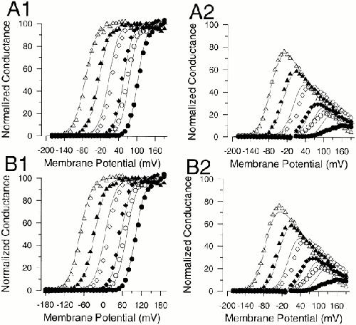 Figure 14. Families of G-V curves obtained from both steady-state and tail current measurements do not distinguish between Fig. 1 and Fig. 2. Tail current amplitudes and steady-state current amplitudes were measured in one patch at 0, 0.5, 1, 4, 10, and 300 μM Ca2+. The normalized conductance is plotted as a function of command potential with tail current measurements in the left column (A1 and B1) and steady-state current estimates (A2 and B2) on the right. In A, both panels were fit simultaneously with the expanded MWC version of Fig. 2 defined by and . KC = 10.11 ± 0.75; K0 = 0.66 ± 0.05; L(0) = 1775.74 ± 1280; Q = 1.26e ± 0.13; K1(0) = 0.31 ± 0.10; Q1 = 0.44e ± 0.14e; K2(0) = 2.17 ± 3.6; Q2 = 0.19e ± 0.21. In B, both panels were fit simultaneously with similar equations defined by Fig. 1, assuming essentially instantaneous recovery from I to O at the tail current potential. KC = 11.20 ± 0.17; K0 = 0.75 ± 0.04; L(0)=1096.3 ± 243; Q = 1.41e ± 0.045; K1(0) = 0.71 ± 0.14; Q1 = 0.342e ± 0.04. |