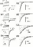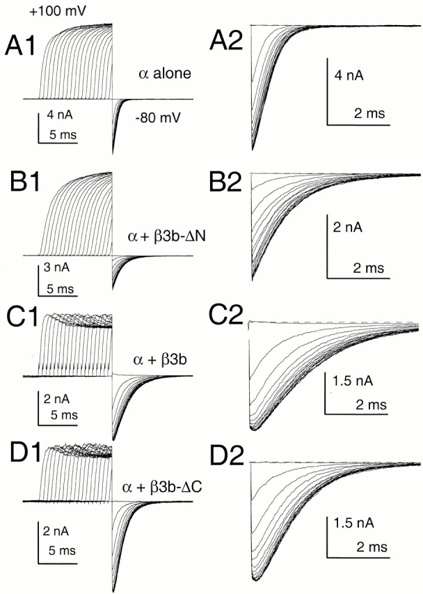 Figure 3. Slowing of deactivation as a function of activation step duration is not unique to α + β3b currents. In A1–D1, outward current was activated with 10 μM Ca2+ by a step to +100 mV from a holding potential of −120 mV. For each sweep, the step to +100 mV was varied from 0 to 9.5 ms in 0.5-ms increments, before a repolarizing step to −80 mV. Currents resulted from the following constructs: (A) α alone; (B) α + β3b-ΔN; (C) α + β3b; and (D) α + β3b-ΔC. For these constructs, a direct step to −80 mV from −120 mV results in minimal inward current activation. A2–D2 show the tail currents on an expanded time base. For α alone (A2) and for α + β3-ΔN (B2), tail currents become slower with command step duration, but the decay qualitatively appears to begin a single exponential time course immediately after the repolarizing step. For α + β3b (C) and α + β3b-ΔC (D), tail current decay also appears to slow with command step duration. However, in contrast to the noninactivating currents, as the command step is increased in duration there is an increase in a shoulder of tail current that precedes the onset of an exponentially decaying current. For all panels, a P/N leak subtraction procedure was used (see materials and methods). |