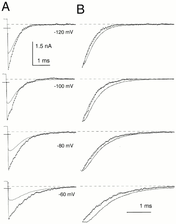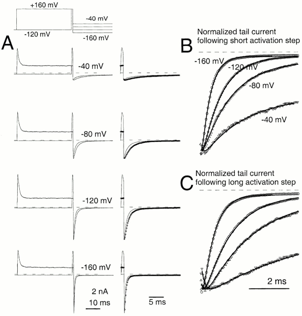 Figure 5. Inactivation is associated with the appearance of a rapid unblocking component in the tail current. In A, a protocol similar to that used in Fig. 2 was used to examine tail currents at repolarization potentials of −40, −80, −120, and −160 mV with 10 μM Ca2+. In the right-hand traces of A, points show every twentieth digitized value for currents resulting from a 40-ms activation step. In B, normalized tail currents after the 2-ms activation step (from A) are shown for the indicated repolarization potentials. Only every fifth digitized value (50 μs) is displayed. At the most positive repolarization potential (−40 mV), there is a pronounced lag before the tail current begins to decay in an exponential fashion. At more negative potentials, after a brief capacitative current, the current begins an exponential decay fairly rapidly. Lines correspond to a fitted two exponential function, A1 · exp(−t/τu) + A2 · exp(−t/τd) + offset, where τu corresponds to an unblocking relaxation, and τd corresponds to the deactivation time course. At −160 mV, τu = 0.087 ms and τd = 0.44 ms; at −120 mV, τu = 0.113 ms and τd = 0.98 ms; at −80 mV, τu = 0.172 and τd = 1.50 ms; and at −40 mV, τu = 0.134 and τd = 2.16 ms. In C, normalized tail currents activated after a 40-ms activation step are shown over the same range of repolarization potentials. At both −40 and −80 mV, there is a distinct increase in tail current after the capacitative transient. At both −120 and −160 mV, the shoulder of current before the onset of exponential decay is more pronounced than in B. Open symbols again show every fifth digitized data value, whereas solid lines correspond to a two exponential fit to the decay time course. Fitted values were as follows: at −160 mV, τu = 0.128 ms and τd = 0.57 ms; at −120 mV, τu = 0.173 ms and τd = 1.42 ms; at −80 mV, τu = 0.232 ms and τd = 2.415 ms; and at −80 mV, τu = 0.183 and τd = 5.64 ms. |