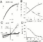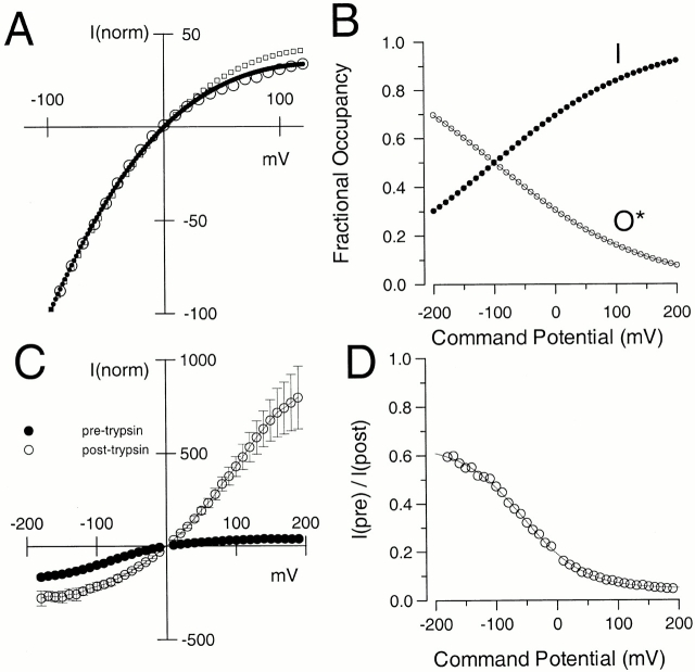 Figure 9. Despite fast unblocking, α + β3b tail currents exhibit a residual voltage-dependent blockade at negative potentials. In A, the instantaneous I-V curve obtained with 10 μM Ca2+ (○) is replotted (from Fig. 8 C) along with the fit for the case where Gmax was constrained to 2.0 (•). Predictions based on the values given in Table and used for the simulations in Fig. 15 are also shown (□; also see Online Supplemental Materials available at http://www.jgp.org/cgi/content/full/117/6/583/DC1). In B, based on the values for K2(V) obtained from the fit shown in A, fractional occupancy in O*n (○) and In (•) was calculated and plotted as a function of the potential at which the tail current was measured. In C, tail current amplitudes (normalized to −100 mV) were measured for three patches before (•) and after (○) removal of inactivation with trypsin. In D, the ratio (○) of tail current amplitude at 100 μs before trypsin application to that after removal of inactivation is plotted as a function of repolarization potential. Note the correspondence of these values to those for O*n in panel B. The solid line is a fit of the following equation:fV=fmax1+K0exp−zFVRT,where fmax = 0.613, K(0) = 3.32 and z = −0.503. |