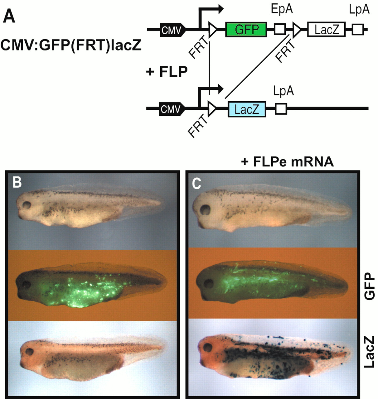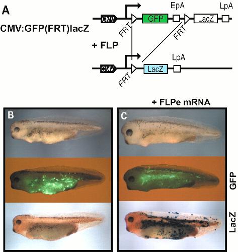 Figure 1. Constitutive FLP activity in Xenopus embryos. (A) The FLP reporter construct CMV:GFP(FRT)lacZ is schematically drawn with the CMV promoter/enhancer driving the expression of the GFP and lacZ genes. The position of the SV40 early (EpA) and late (LpA) polyadenylation signals as well as the FRT target sites of the FLP are given. (B and C) Stage 36 Xenopus larvae were derived from eggs injected with CMV:GFP(FRT)lacZ DNA (B) or coinjected with CMV:GFP(FRT)lacZ DNA and FLPe mRNA (C). The living animals were photographed in normal light (top) or in fluorescence light (middle). X-gal staining was obtained after fixation of the larvae (bottom).